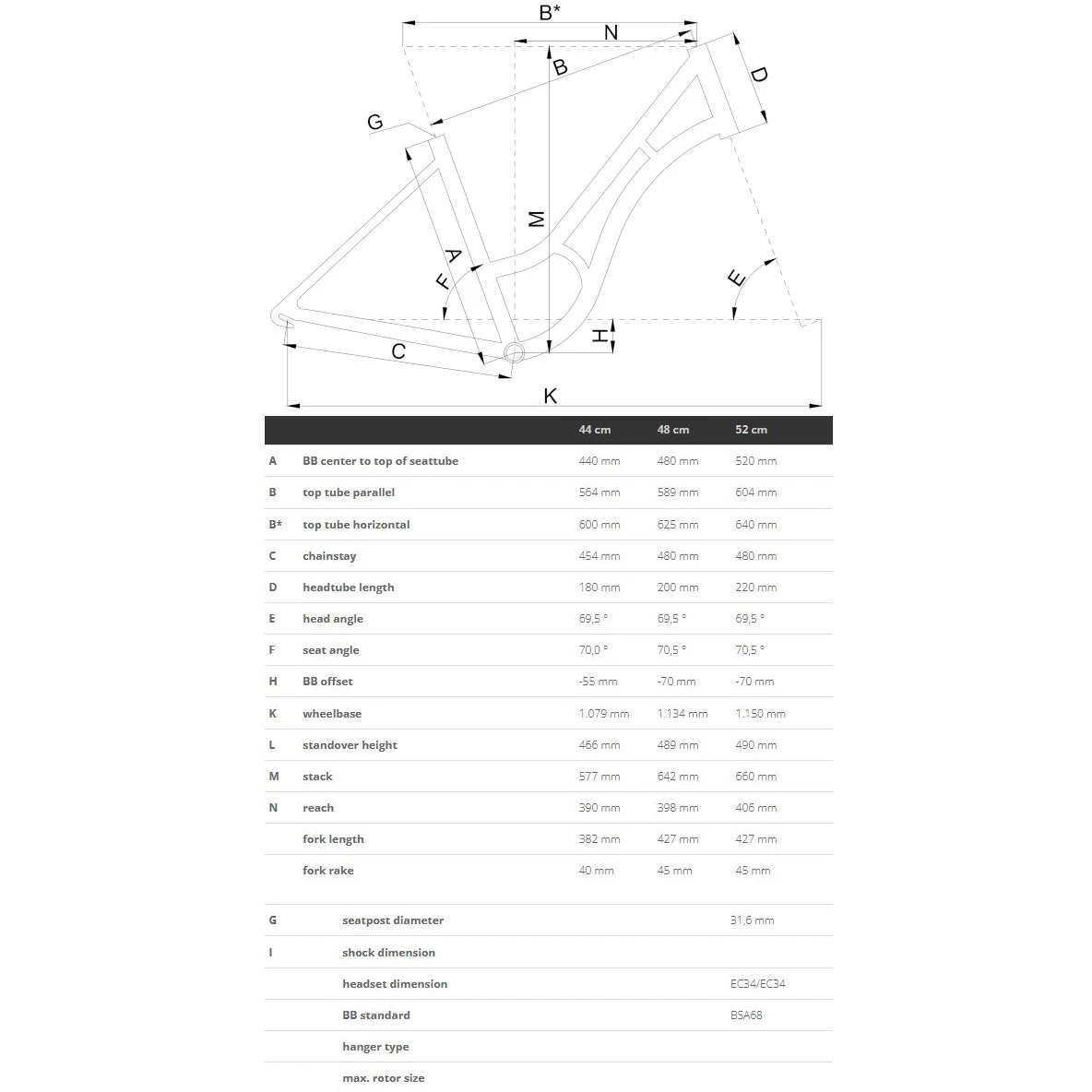 - De 44cm framemaat heeft 26″ wielen, terwijl de 48cm en 52cm maten 28″ wielen hebben.