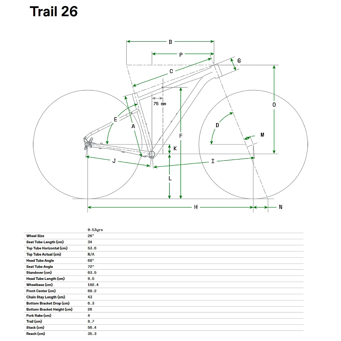 Full-size 26-inch wielen eten hobbels als ontbijt en rollen moeiteloos over wortels. Ze zijn wendbaarder dan de grotere 27,5 inch wielen van veel fietsen voor volwassenen. De lage stahoogte zorgt voor stabiliteit en veel ruimte om te groeien.