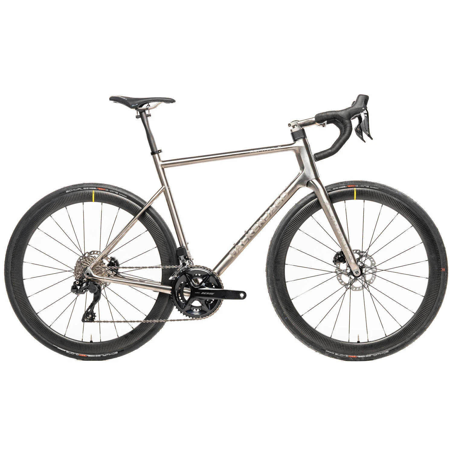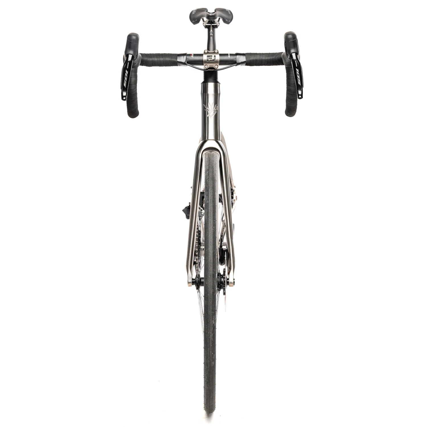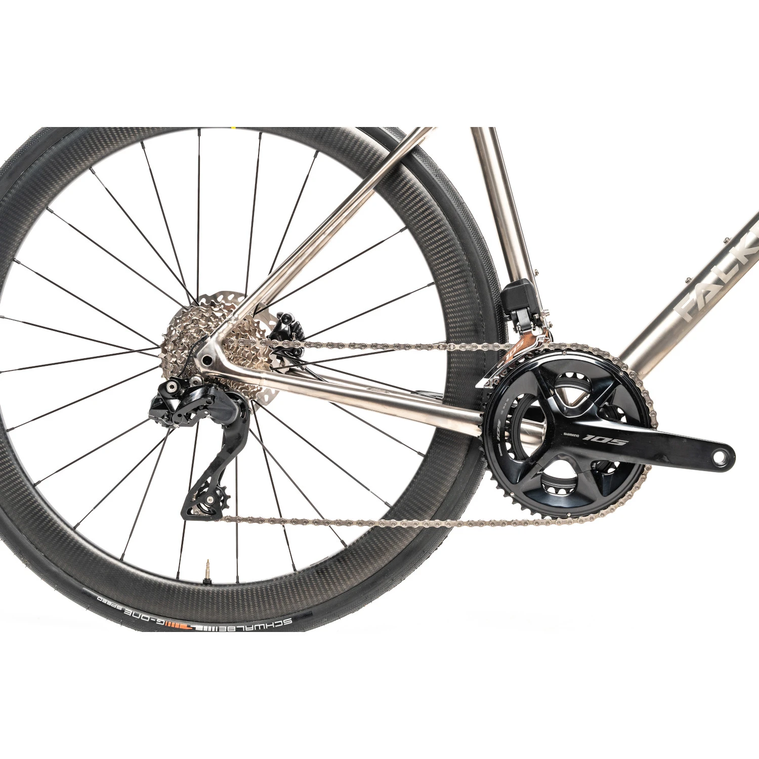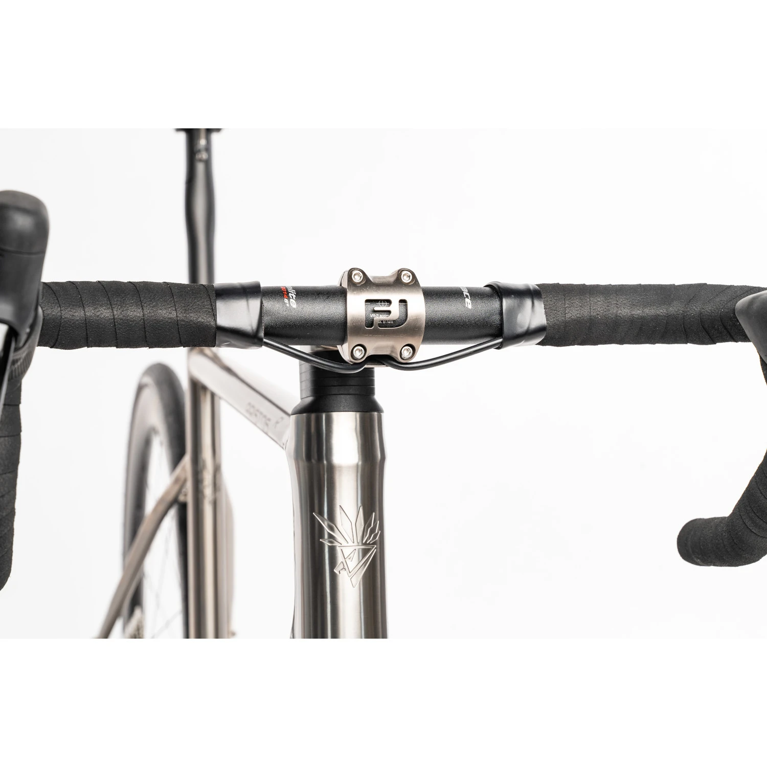 Falkenjagd herinterpreteert het materiaal titanium met de Aristos R Speedgravel. Vakkundig wordt vakmanschap gecombineerd met innovatieve productieprocessen. De Aristos R fascineert met een vloeiende designtaal en een onovertroffen integratie van lijnen en bevestigingen. Het frame profiteert van de duurzaamheid van het materiaal titanium, zonder bang te hoeven zijn voor prestatieverlies als gevolg van de gebruikte fabricageprocessen. De titanium stuurpen komt ook uit de 3D-printer. Hij is iets hoekiger dan gesmede stuurpennen, in overeenstemming met de designtaal van het frame, maar net zo duurzaam. Het frameontwerp biedt niet alleen goede trillingsdemping, maar ziet er ook netjes uit dankzij de geïntegreerde kabelgeleiding. Hierdoor scoort de Aristos R Speedgravel met een hoge mate van integratie die anders alleen op moderne carbon racefietsen te vinden is.