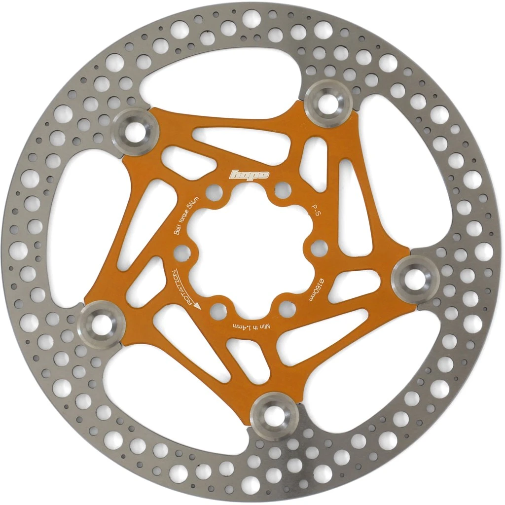 De zwevende remschijven van Hope zijn een visueel hoogtepunt op elke fiets. Naast het mooie, individuele uiterlijk verhoogt de aluminium drager de stijfheid van de gehele schijf, minimaliseert hij het gewicht en verbetert hij de warmteafvoer. Zo kan de schijf in de hitte uitzetten en inkrimpen zonder te vervormen.