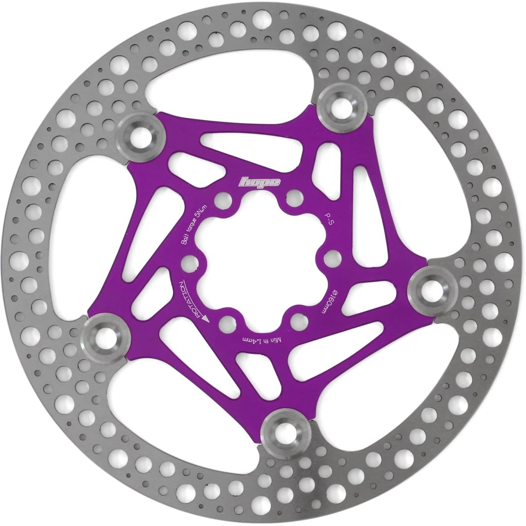 De zwevende remschijven van Hope zijn een visueel hoogtepunt op elke fiets. Naast het mooie, individuele uiterlijk verhoogt de aluminium drager de stijfheid van de gehele schijf, minimaliseert hij het gewicht en verbetert hij de warmteafvoer. Zo kan de schijf in de hitte uitzetten en inkrimpen zonder te vervormen.