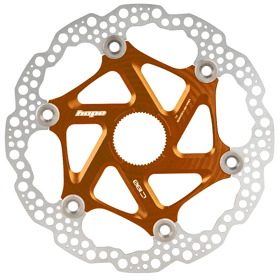 Zwevende remschijf met herziene, vergrote frictiering voor Hope hydraulische schijfremmen. Geschikt voor naven met Centerlock bevestiging. Verkrijgbaar in verschillende maten. De zwevende remschijven van Hope zijn een visueel hoogtepunt op elke fiets. Naast het mooie, individuele uiterlijk verhoogt de aluminium drager de stijfheid van de gehele schijf, minimaliseert hij het gewicht en verbetert hij de warmteafvoer. Zo kan de schijf in de hitte uitzetten en inkrimpen zonder te vervormen.Â