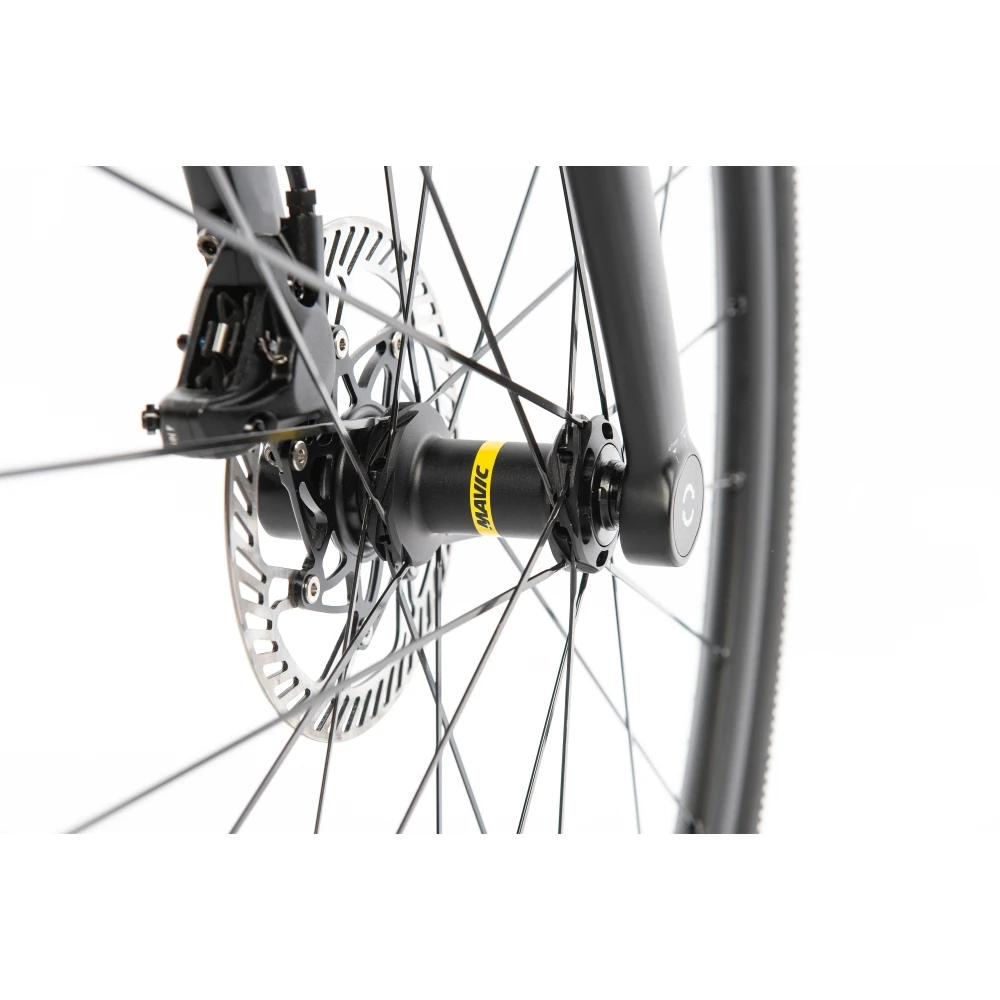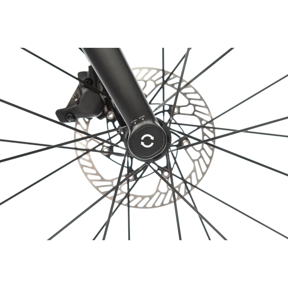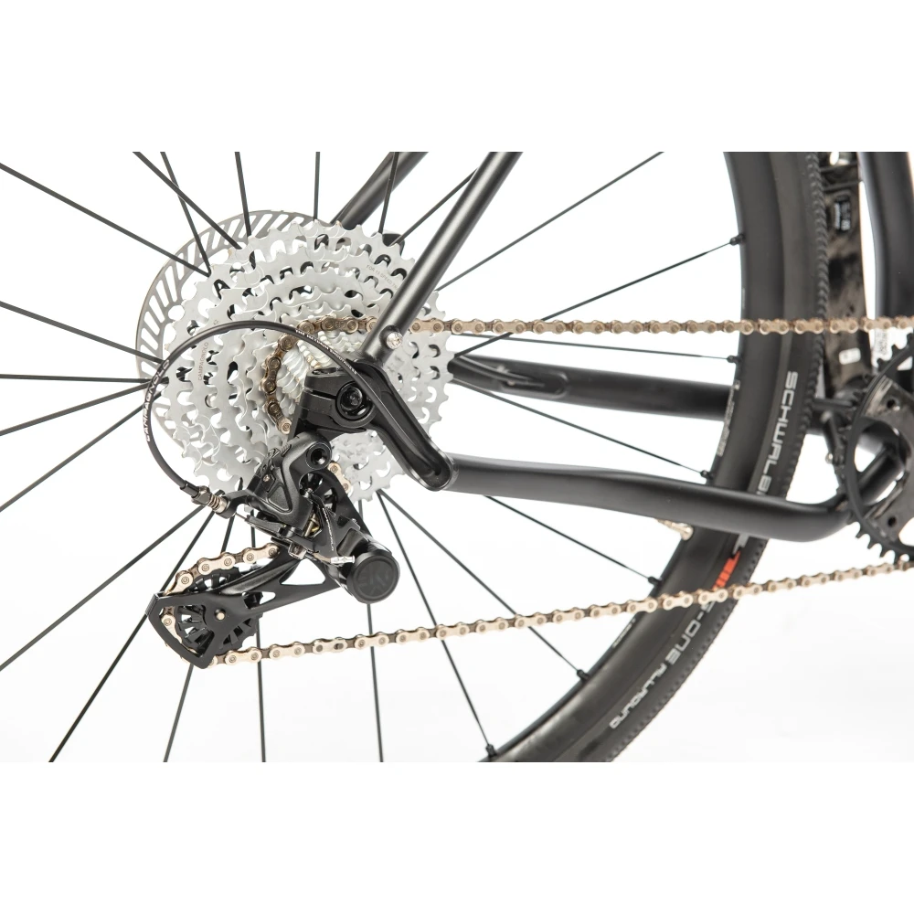 Bovendien is het frame geschikt voor een speciaal ontworpen bagagedrager. Een speciaal ontworpen carbon zadelpen met bladveerontwerp in het balhoofdgedeelte zorgt ook voor een uitstekende flexibiliteit. Bovendien is de achtervork aan de rechterkant naar beneden getrokken om meer ruimte te bieden voor de ketting, speciaal voor de moderne 1x-aandrijvingen. Met geoptimaliseerde buisvormen, een spoornauwkeurige vork en de Campagnolo EKAR schakelgroep vertegenwoordigt dit wiel in alle opzichten een nieuwe maatstaf onder de Gravel bikes.