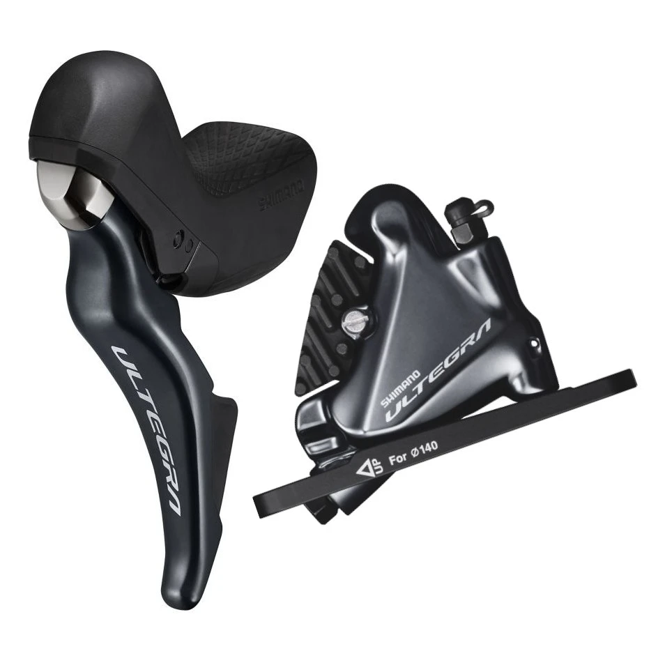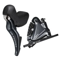 Ultegra schakel-/remset bestaande uit de ST-R8020 dubbele bedieningshendel voor nauwkeurig schakelen en de BR-R8070 hydraulische remklauw voor remcontrole onder alle omstandigheden.