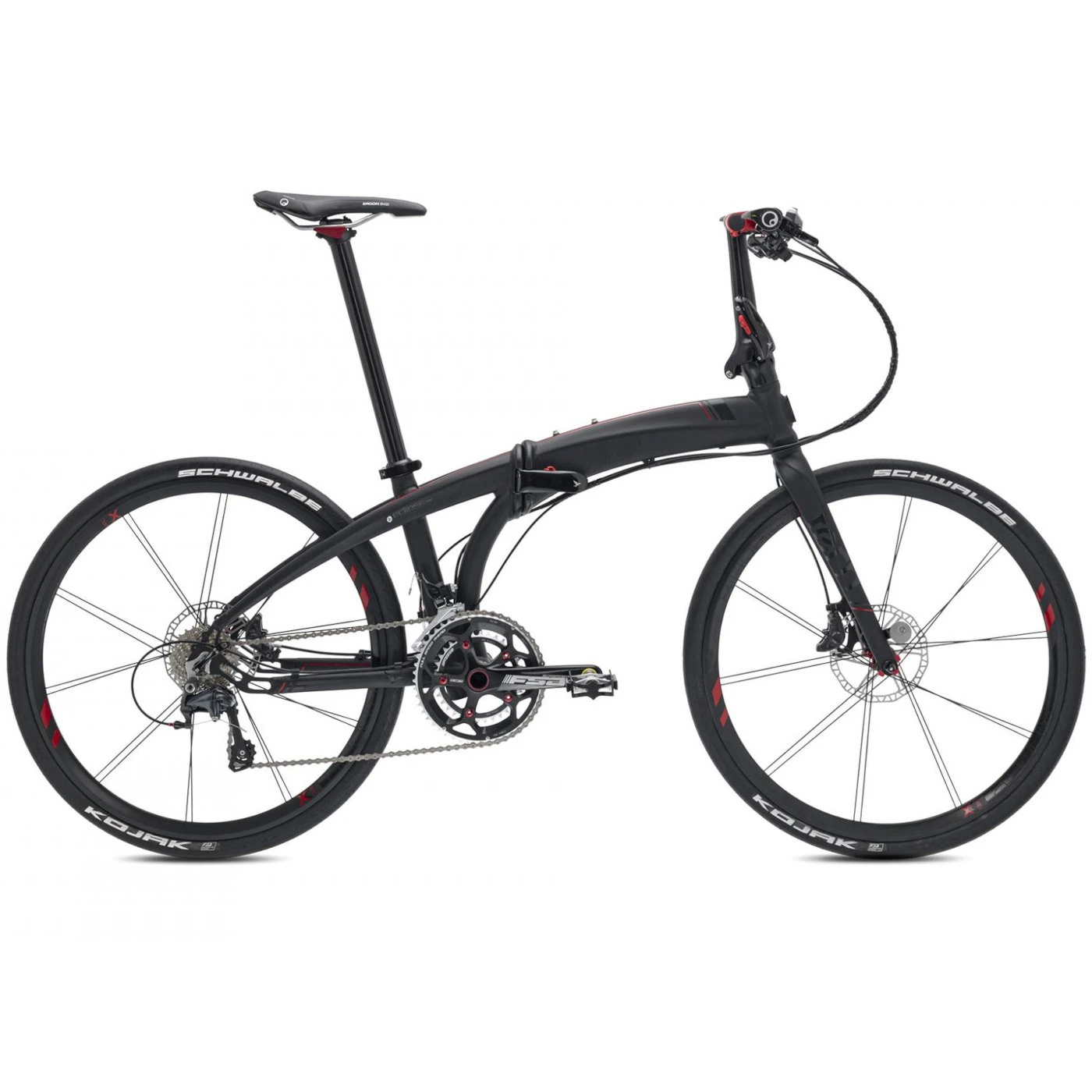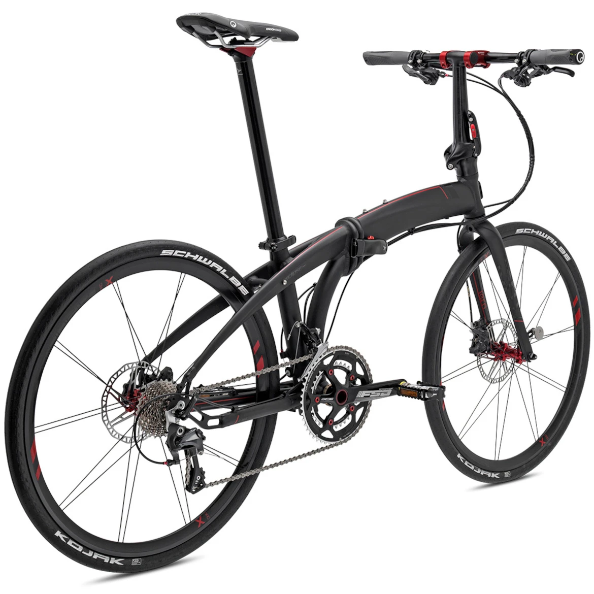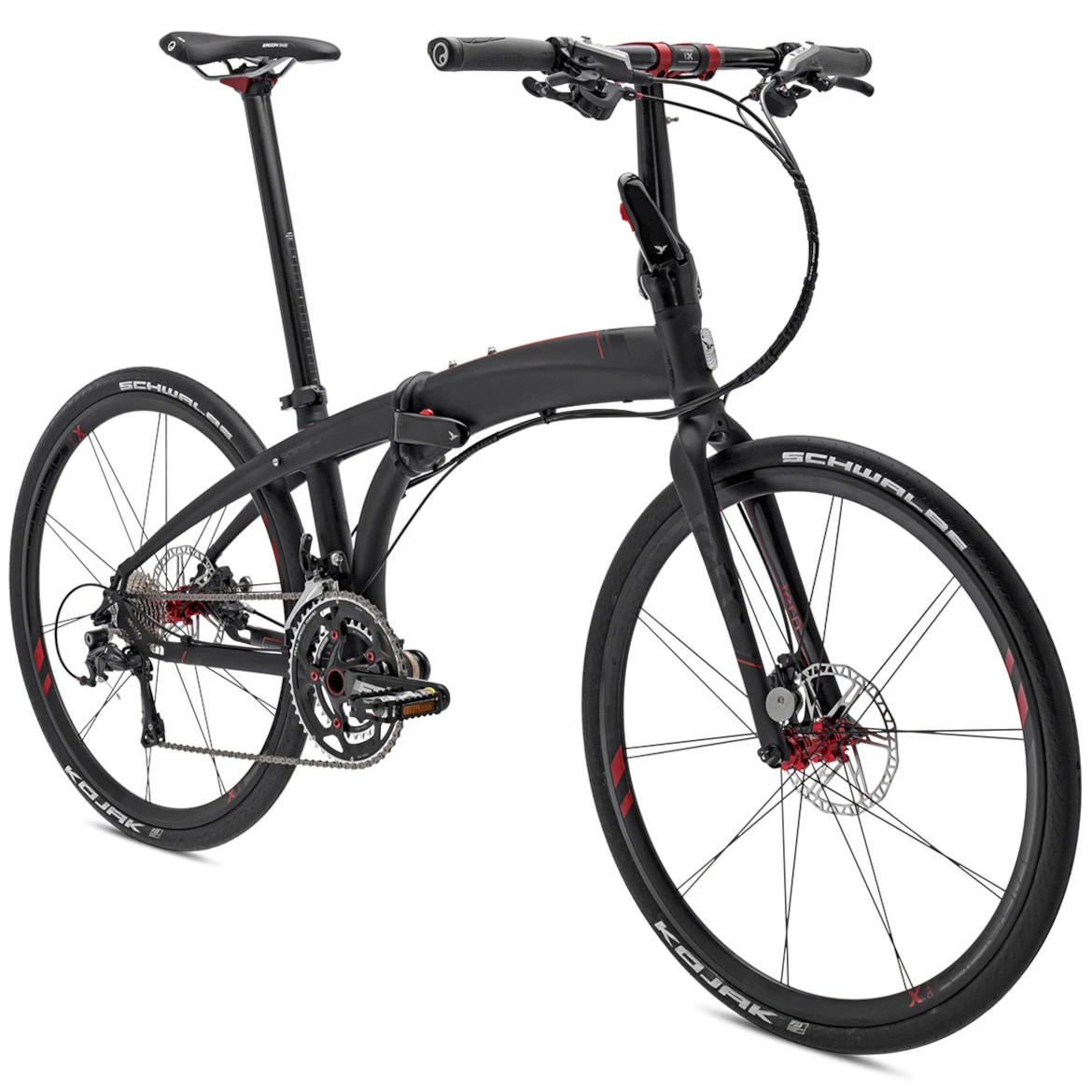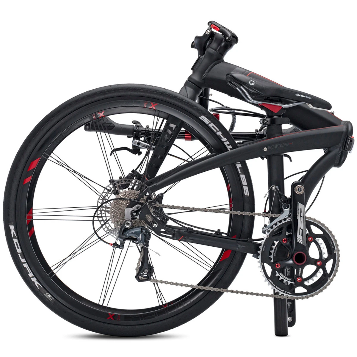 De Eclipse X22 is ontwikkeld als pijlsnelle vouwfiets: met handgemaakte 26″ wielen en een op races geïnspireerde geometrie – plus hij kan in tien seconden worden opgevouwen tot een klein pakketje. Als hij eenmaal in beweging is, wordt hij opgewonden door zijn Shimano Ultegra aandrijving en snelle hydraulische schijfremmen, ook van Shimano. En voor het oog heeft hij een fluweelmat zwarte coating, de hydrogevormde Tarsusâ„¢ vork en rode accenten op de variabele VRO stuurpen en de Stasis zadelpen van Syntace.